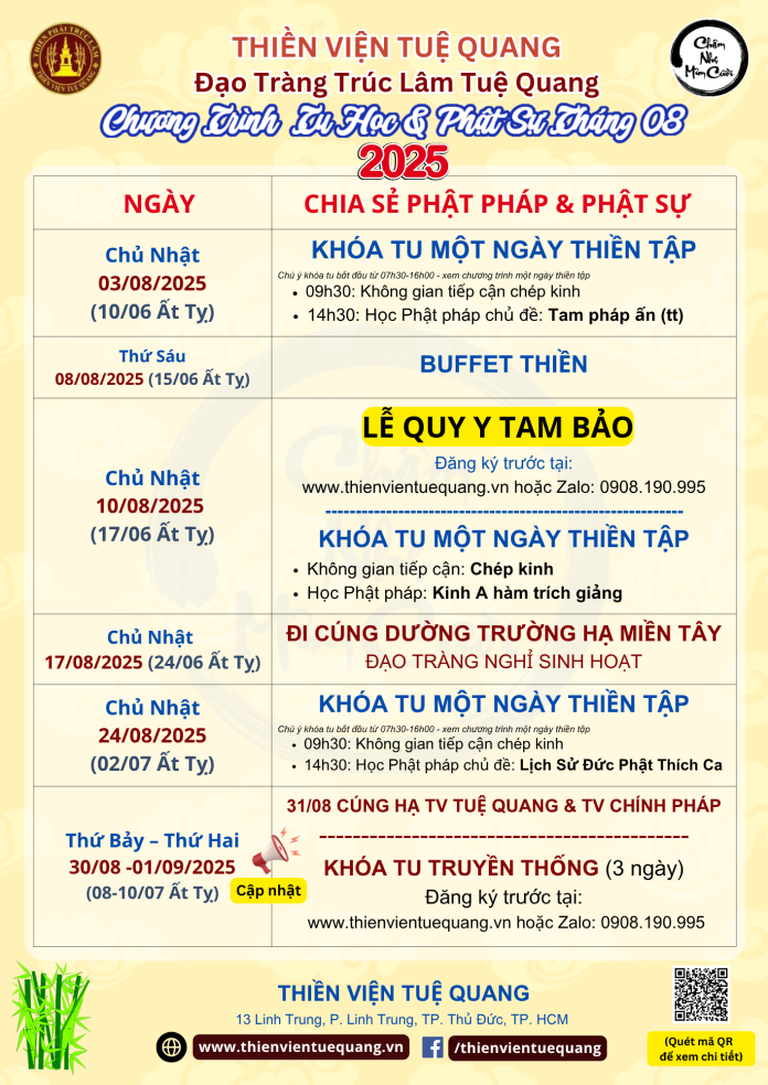 Thứ Bảy – Thứ Ha 30/8 – 01/09 (08-10/07/Ất Tỵ) | 31/08 CÚNG HẠ TV TUỆ QUANG & TV CHÍNH PHÁP KHÓA TU TRUYỀN THỐNG (Khóa tu 3 ngày) Đến form đăng ký |
